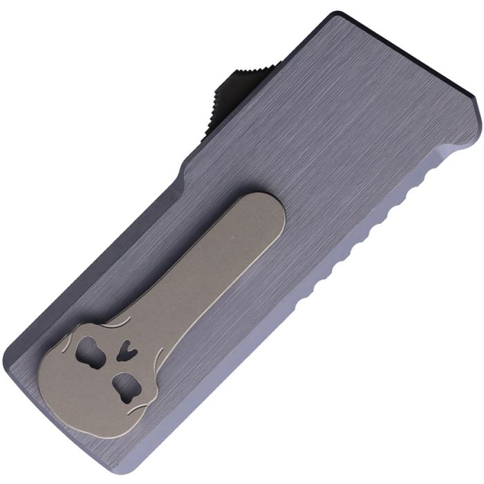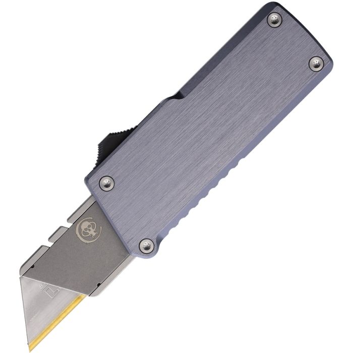 3.38″ (8.59cm) closed. 1″ (2.54cm) blade. Blue-Gray brushed aluminum handle. Pocket clip. Replaceable utility blade. Classic Chaves Skull pocket clip.