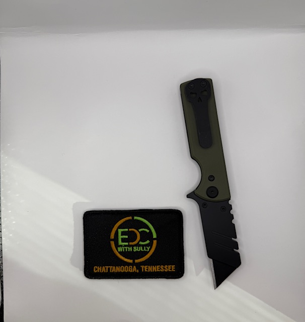 Chaves – C.H.U.B. Flipper Linerlock PVD OD Green G-10 – 3.5″ (8.89cm) closed. Black canvas micarta handle. Extended tang. Pocket clip. 2″ black PVD coated stainless blade holder.