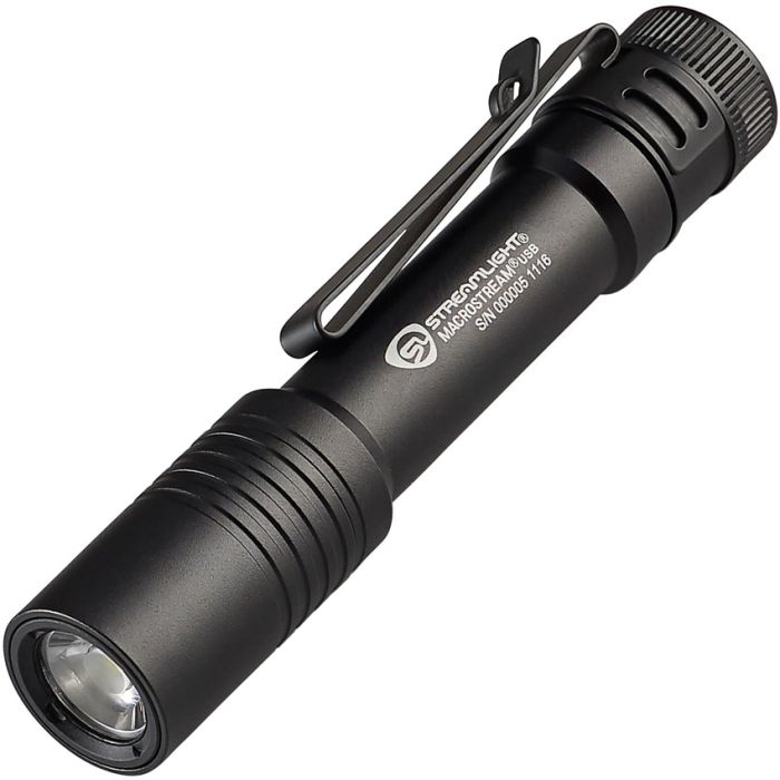 MacroStream USB Flashlight. 4.5″ overall. Rechargeable. Water resistant. Impact resistant. Tailcap switch. Clip. Lanyard. Weight: 2.2oz. Modes: High (500 lumens, 2h runtime); Low (50 lumens, 8h runtime). Metal sleeve protects charge port. USB cord. 90m beam distance. Requires (1) Lithium battery (included). Aluminum construction. Color: Black. Boxed.