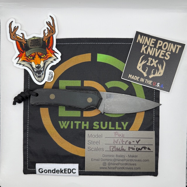 The Nine Point Knives × EDCwithSully Collaboration Fox is a USA, handmade, Nitro-V EDC built for versatility. With a 6.5-inch overall length and 3-inch drop-point blade, it delivers precision, comfort, and reliability. Its ergonomic handle provides a secure grip, making it a lightweight and stylish everyday carry companion.